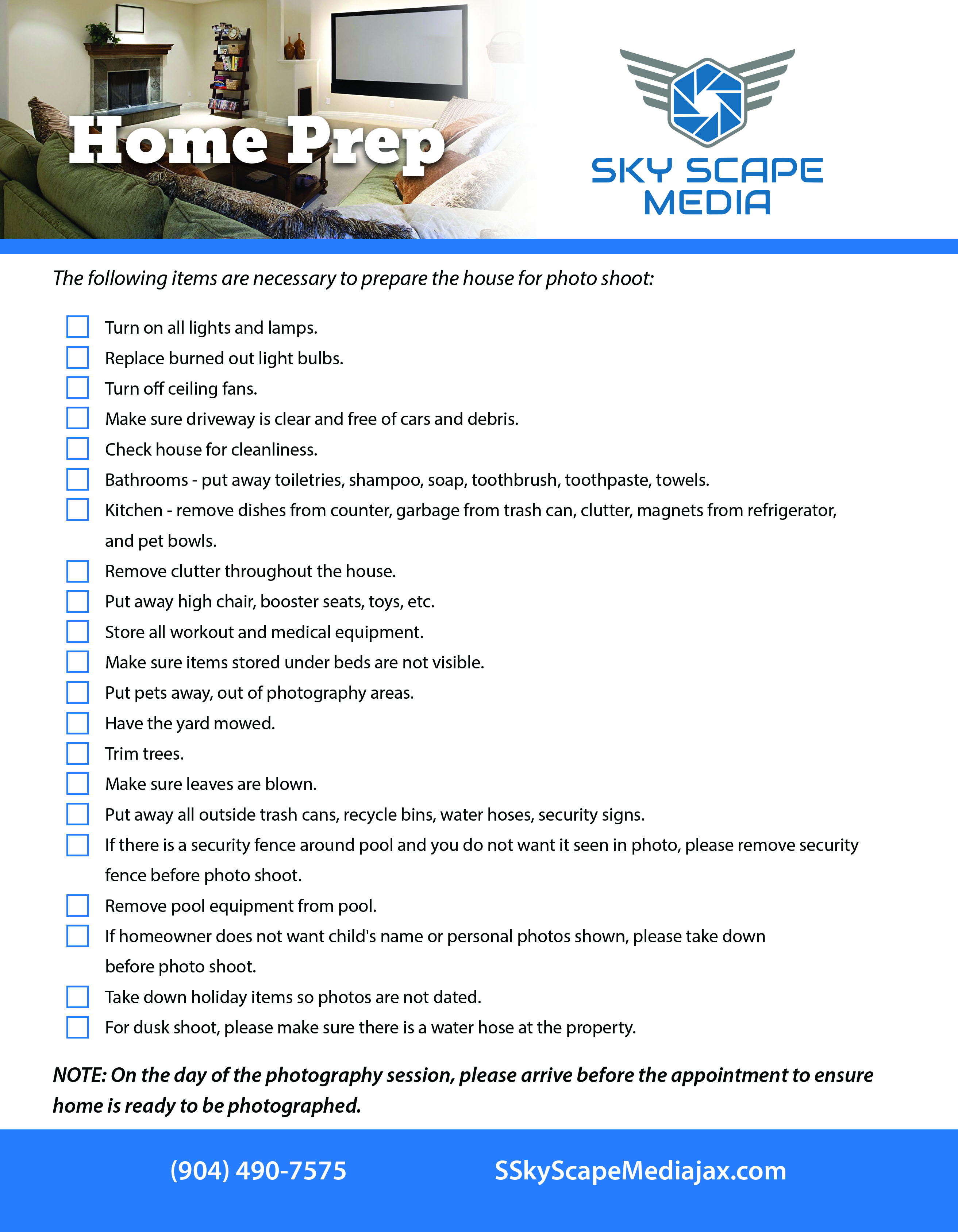 After setting an appointment with Sky Scape Media, please review the home preparation flyer to ensure your property is ready for the photo shoot. Here you will see all those requirements for photography